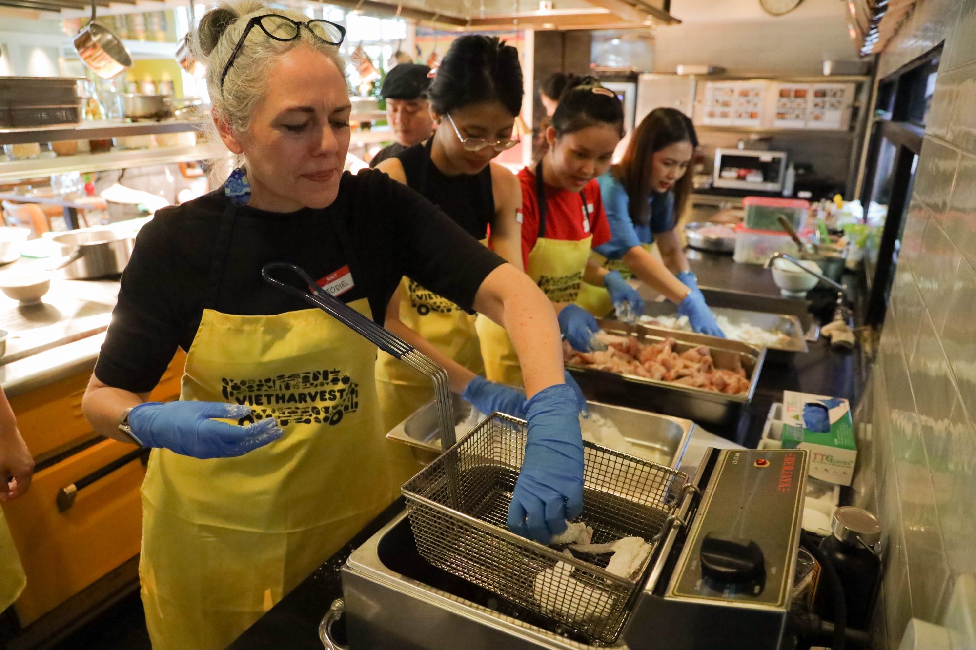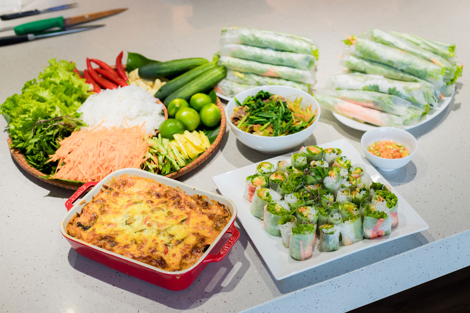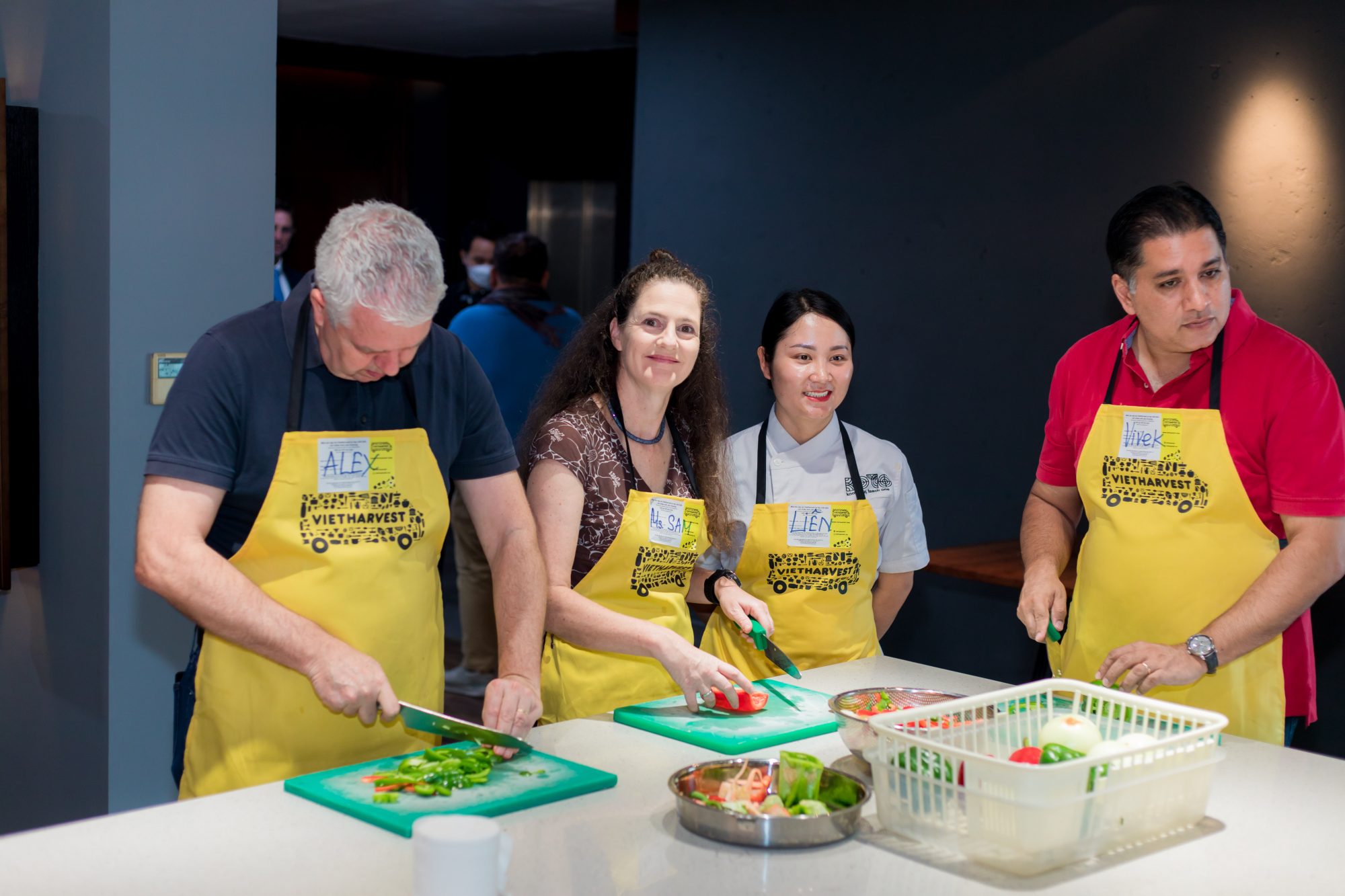 Đoàn, nhóm khách quốc tế muốn tìm hiểu về cách chế biến món ăn Việt Nam.